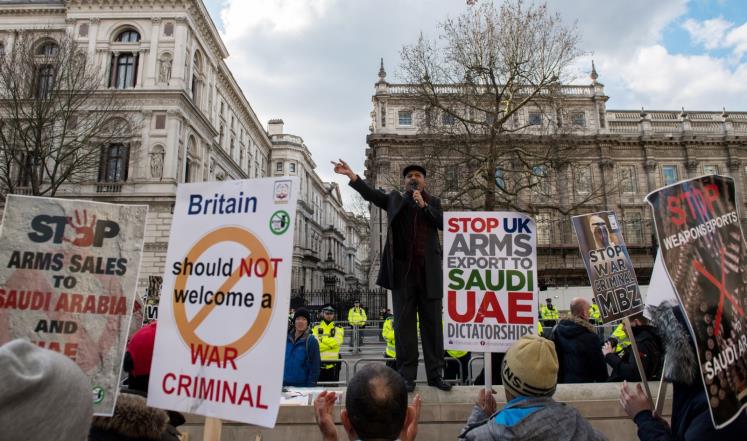 وتجمع المحتجون أمام مقر رئيسة الوزراء في 10 داوننغ ستريت في أثناء لقائها بولي العهد السعودي، ورفعوا لافتات تندد باستقبال "مجرم حرب"، وتطالب بإنهاء الحرب في اليمن.