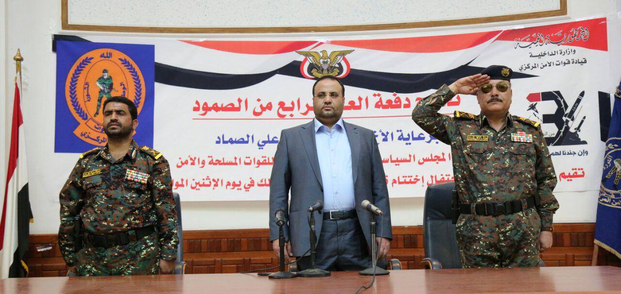 جاء ذلك خلال حفل تخرج دفعة العام الرابع لقوات الأمن المركزي ، حيث قال الرئيس الصماد أن " هذه الفعالية التي نستطيع أن نقول أنها الأكبر في المنطقة وفي ظل عدوان وجبهات على طول خطوط التماس تأتي هذه المؤسسة لتثبت من جديد أنها بمستوى المسؤولية والتحدي ".