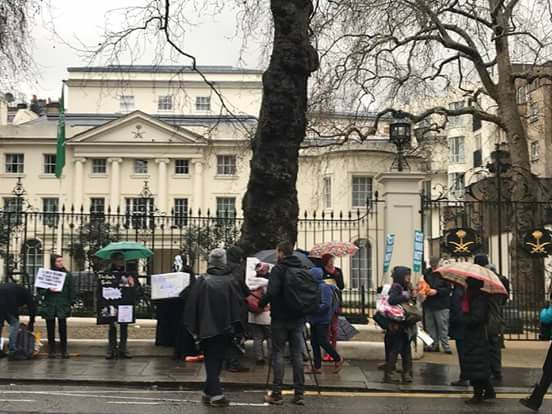 احتج ناشطون حقوقيون من مؤسسة "أوقفوا تجارة الأسلحة"، اليوم ، أمام سفارة الرياض في لندن، لمطالبة الحكومة البريطانية بوقف بيع الأسلحة للسعودية، وتنديداً بـ"جرائم" السعوديةفي اليمن.