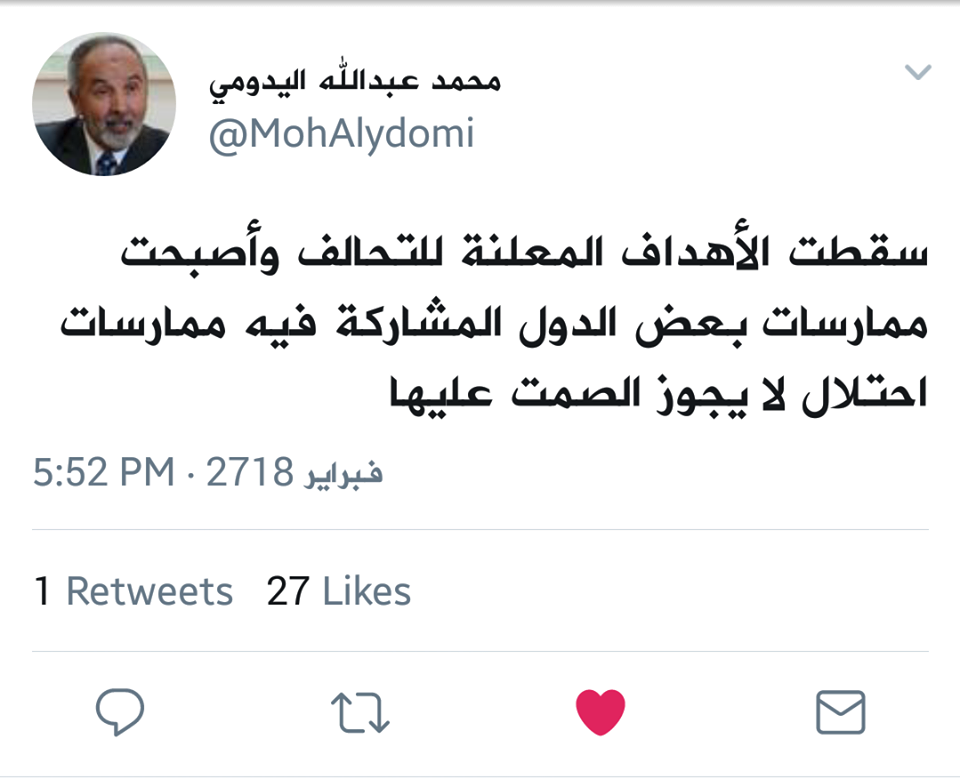 وقال اليدومي في تغريده نشرها على حسابه في تويتر قبيل دقائق من مساء اليوم الثلاثاء وتداولها ناشطون: " إن الأهداف المعلنة للتحالف سقطت ، مشيرا إلى أن ممارسات بعض الدول المشاركة في التحالف أصبحت ممارسات احتلال، وذلك في إشارة إلى الدور الذي تمارسه الإمارات العربية المتحدة في المحافظات الجنوبية. وأكد اليدومي إن الصمت على هذه الممارسات لا يجوز.