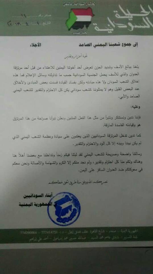 وأضاف" فما هذه أخلاق الشعب السوادني ولا مبادئه ، ولكن بفساد القيادة فسدت بعض المبادئ والأخلاق عند البعض القليل وهم لا يمثلوننا كشعب سوداني يكن كل الاحترام والتقدير للشعب اليمني الصامد الأبي".