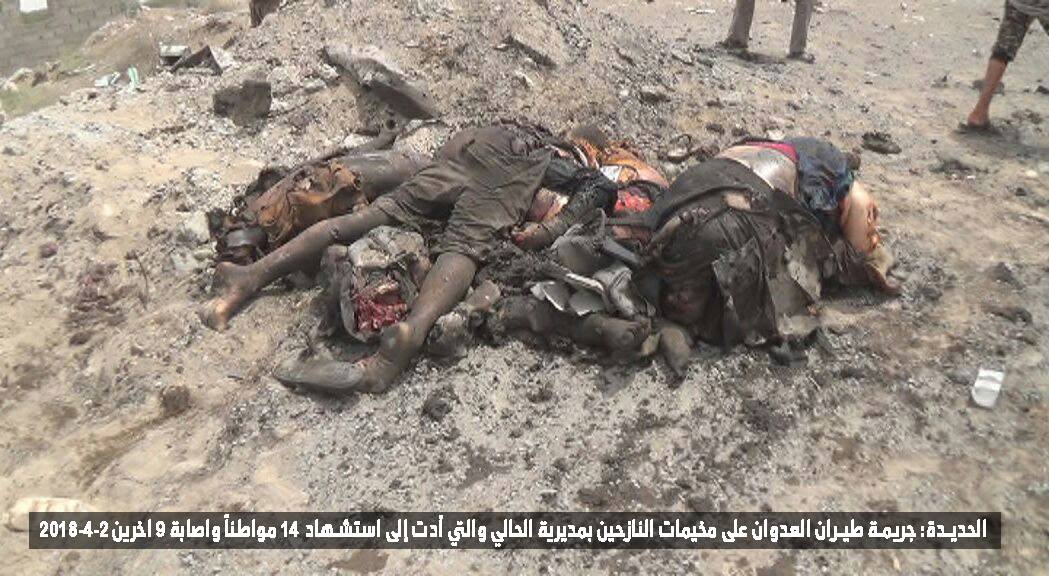 وذكرت مصادر محلية أن الغارتين لطيران العدوان استهدفتا مخيمات النازحين بمديرية الحالي بمحافظة الحديدة، وأن النازحين المستهدفين فيها من مدينة حيس، ومن بين الشهداء 7 أطفال بالإضافة إلى عدد من النساء ، مشيرة إلى أنها حصيلة أولية .