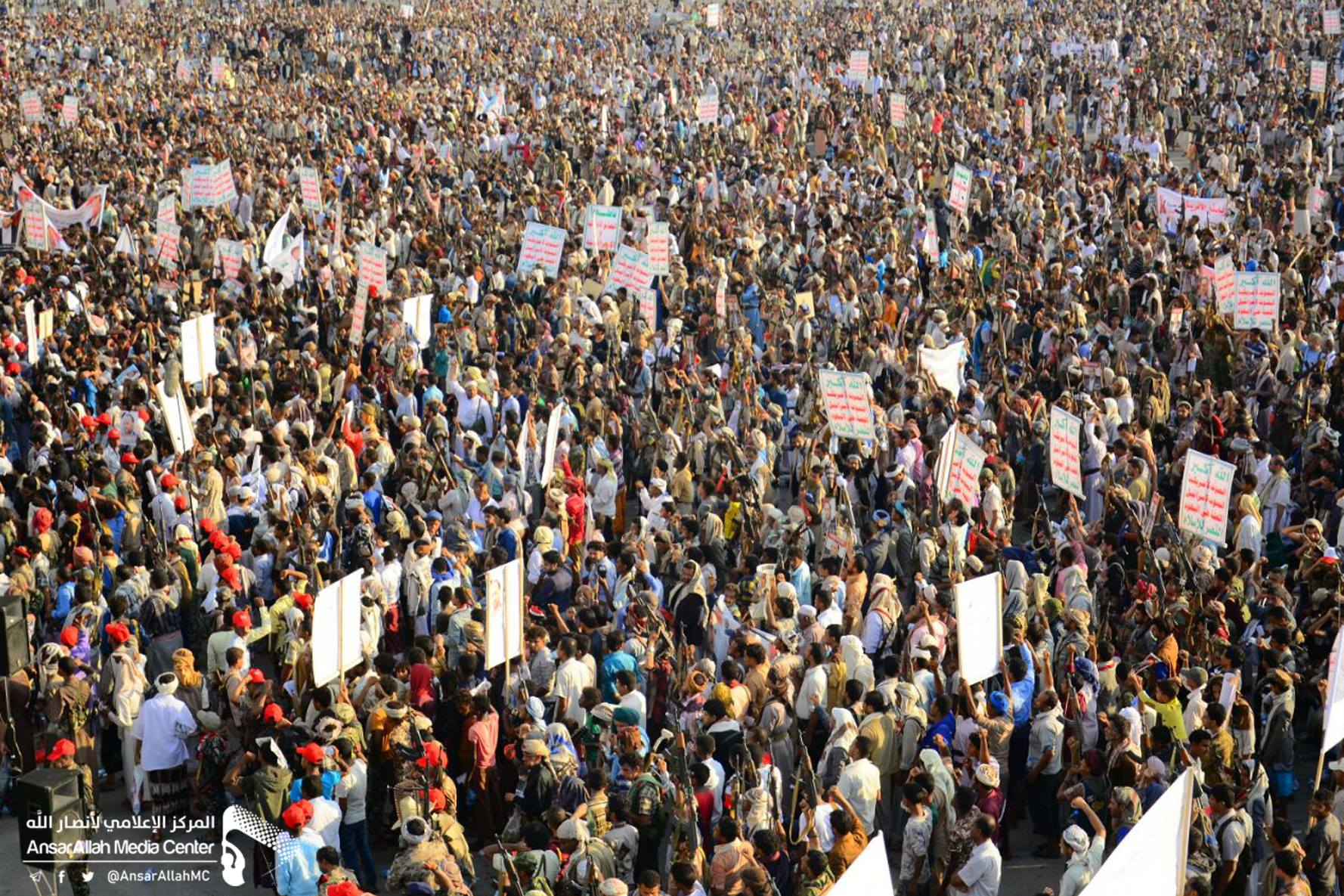ورفع المتظاهرون عشرات الآلاف البنادق وأعلام اليمن ولافتات كتب عليها عبارات التحدي في وجهة أمريكا ، فيما ردد المشاركون فيها عبارات حملت المضمون ذاته.