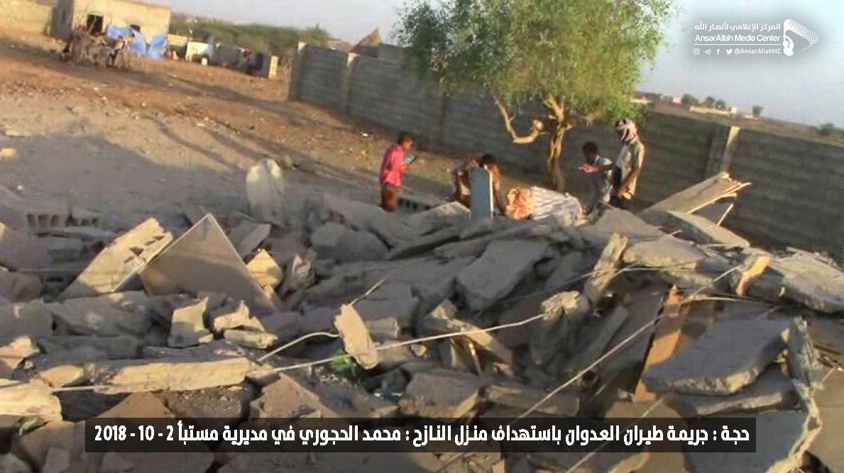 استهدف طيران تحالف حرب العدوان فجر يومنا هذا الثلاثاء منزل المواطن محمد علي حسن حجوري نازح من مديرية حيران إلى مديرية مستباء والذي استهدفه الطيران بغاره جويه اودت بأسرته كامله حيث استشهد النازح محمد علي حجوري مع زوجته وابنته البالغة من العمر تسع سنوات .