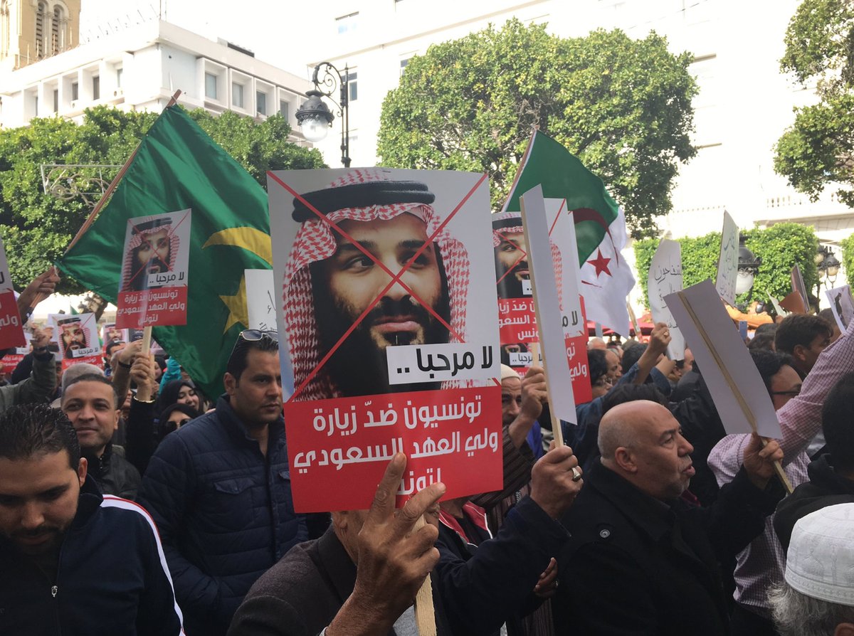 خرج الاف التونسيين، اليوم الثلاثاء، بمسيرة حاشدة في شارع الحبيب بورقيبة وسط العاصمة التونسية، احتجاجاً على زيارة ولي العهد السعودي محمد بن سلمان المقررة مساءً إلى بلادهم، متهمين إياه بأنه قاتل، في ثاني يوم على التوالي من احتجاجات تندد بمشاركة المملكة بحرب اليمن وبجريمة قتل الصحافي السعودي جمال خاشقجي.